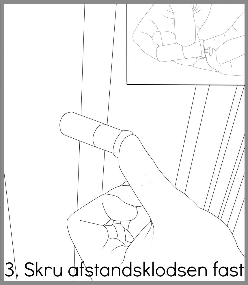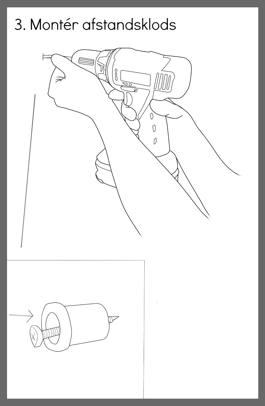 3. Skru afstandsklodsens hun-del fast på facaden. Vælger du at anvende en anden skrue end den medfølgende, så vælg en rustfri skrue da dekorationen skal pryde facaden i lang tid. |
