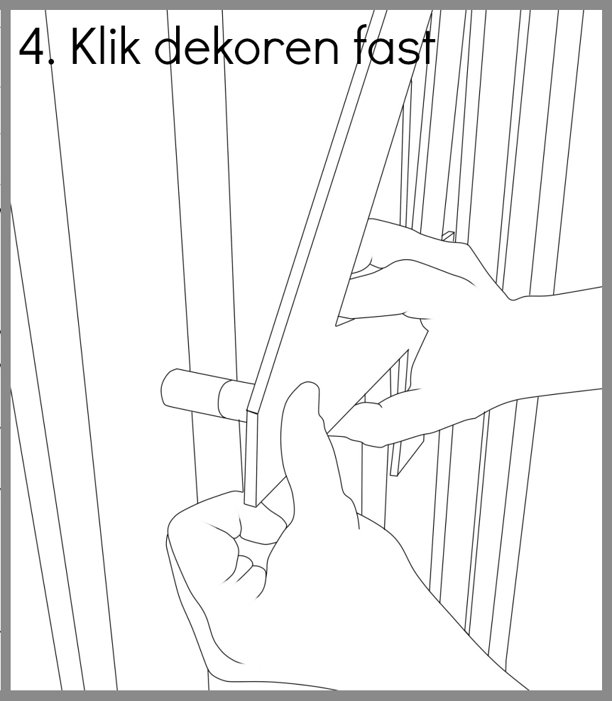 4. Placér afstandsklodsens han-del i hun-delen og tryk dekorationen fast. Skulle der være en mindre afvigelse mellem det færdigborede hul og skabelonen, kan du tilpasse hun-delen ved at løsne skruen lidt. På den måde kan du lettere trykke dekorationen fast, og den vil stadig sidde stabilt på facaden. OBS! "Slå" ikke på dekorationen, da slag kan skade plastmaterialet eller i værste fald ødelægge afstandsklodserne. Er boringen udført korrekt, er det let at klikke dekorationen fast i hun-delen. |