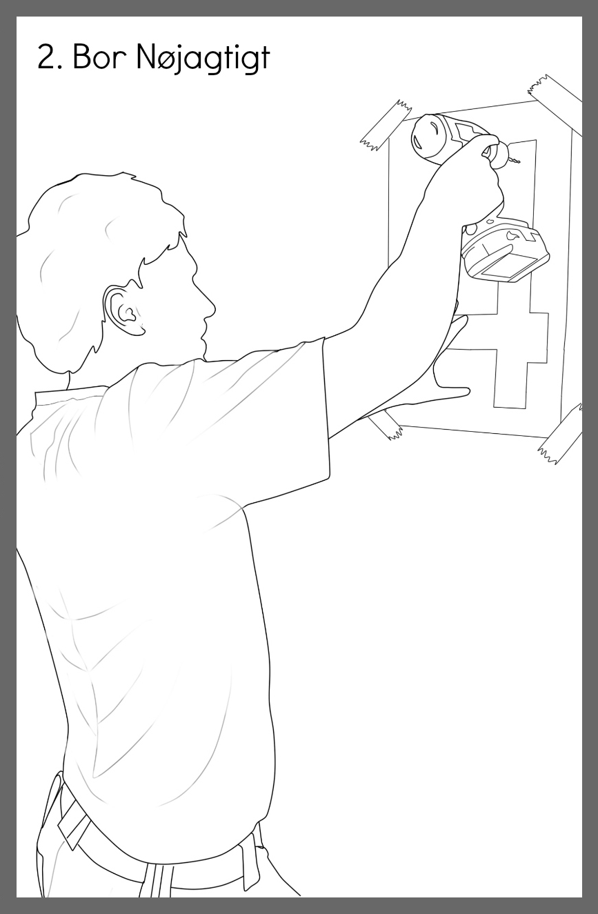 2. Når du har fundet den rigtige placering kan du begynde at bore. Vælg et bor og boreteknik, der passer til materialet på facaden. Til mursten og beton skal du anvende slagboremaskine samt den størrelse bor, der passer til rawpluggen. Vær meget nøjagtig når du borer. Det er vigtigt, at du borer hullerne så tæt på skabelonens markeringer som muligt, da fejlagtigt placerede huller kan føre til for stor belastning af afstandsklodserne som derfor risikere at knække. |